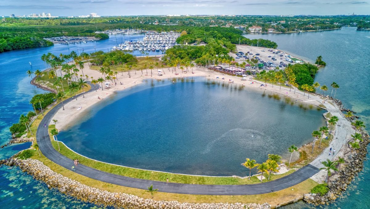 Esta piscina está rodeada de piedra caliza, coral y una playa de arena circular con palmeras que se mecen y ofrecen vistas perfectas de la costa de Florida. Gracias a las aguas tranquilas de la piscina atolón, se ha convertido en un lugar seguro y popular para que naden los niños pequeños.