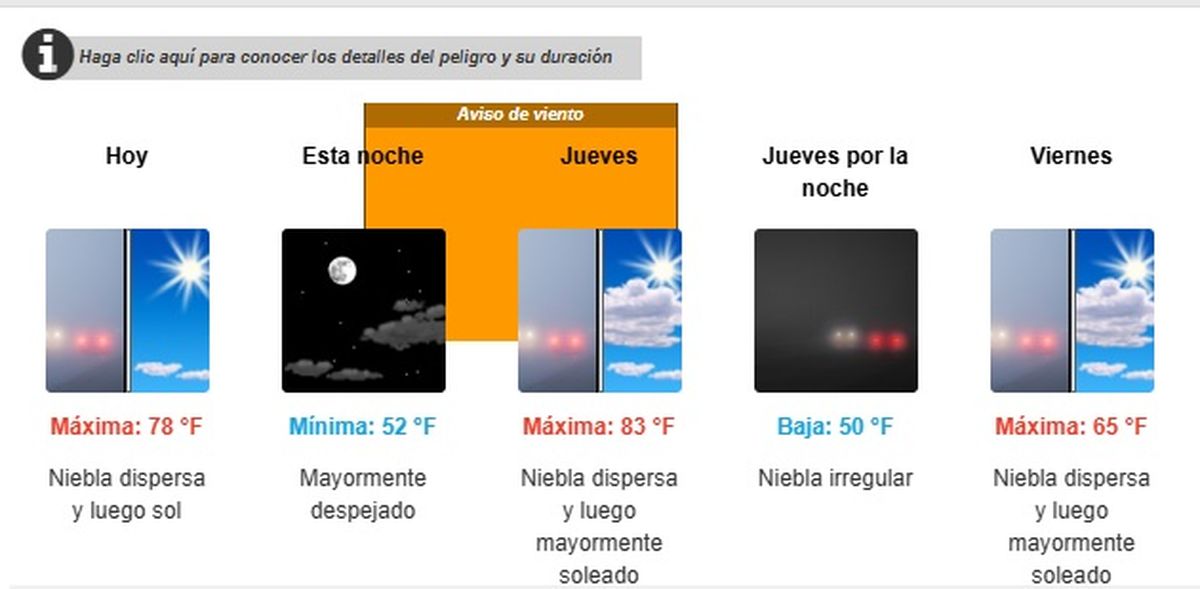 Hoy día habrá niebla dispersa antes de las 10 a. m. Por lo demás, soleado, con una máxima de 78 °F. Viento en calma que se convertirá en oeste a unos 5 mph por la tarde. En la noche estará mayormente despejado, con una mínima de alrededor de 52. Viento del oeste alrededor de 5 mph cambiando al sureste después de la medianoche.
