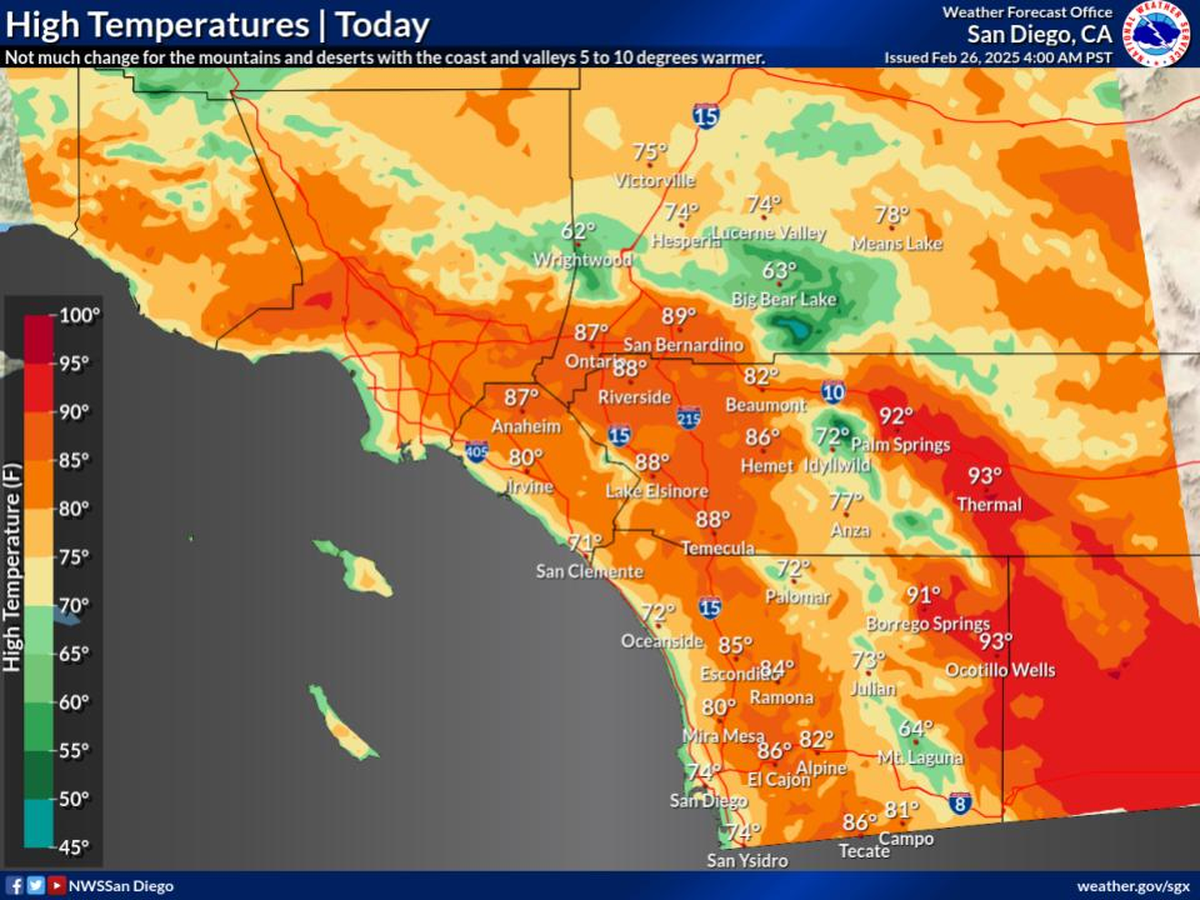 En la cuenta de X, el Servicio Meteorológico Nacional de Estados Unidos compartió que no habrá muchos cambios con respecto al martes en las montañas y desiertos, con la costa y los valles entre 5 y 10 grados más cálidos. Temperaturas máximas para hoy en las áreas costeras: 68 a 80, valles occidentales e interior del condado de Orange: 80 a 86, valles interiores: 80 a 88, montañas entre 4000 y 7000 pies: 62 a 73, desierto alto: 73 a 77, desierto bajo: 88 a 93.