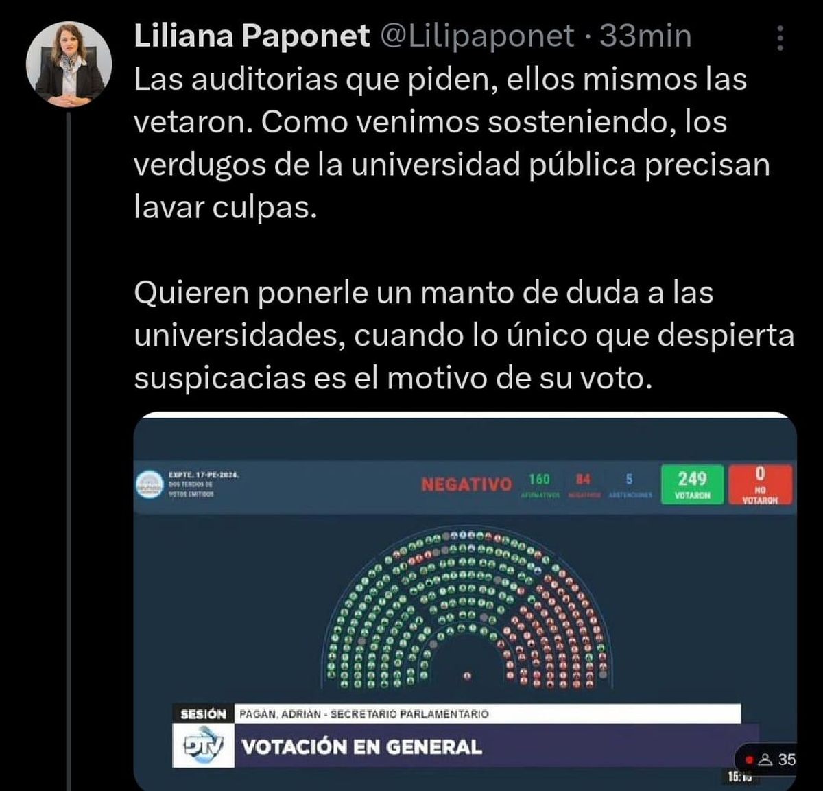 También Liliana Paponet, la tercera diputada peronista por Mendoza, dijo a través de X por qué apoyó el financiamiento de las universidades, y también echó por tierra el argumento de la falta de auditorías de control.
