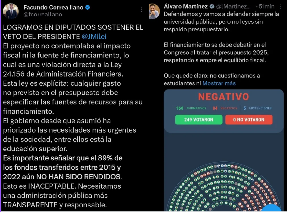Dos de los 10 diputados mendocinos, tres libertarios votaron este miércoles a favor del veto a la Ley de Financiamiento Universitario: Álvaro Martínez, Facundo Correa Llano y Mercedes Llano. De estos, los dos primeros argumentaron el motivo de su decisión en las redes sociales.