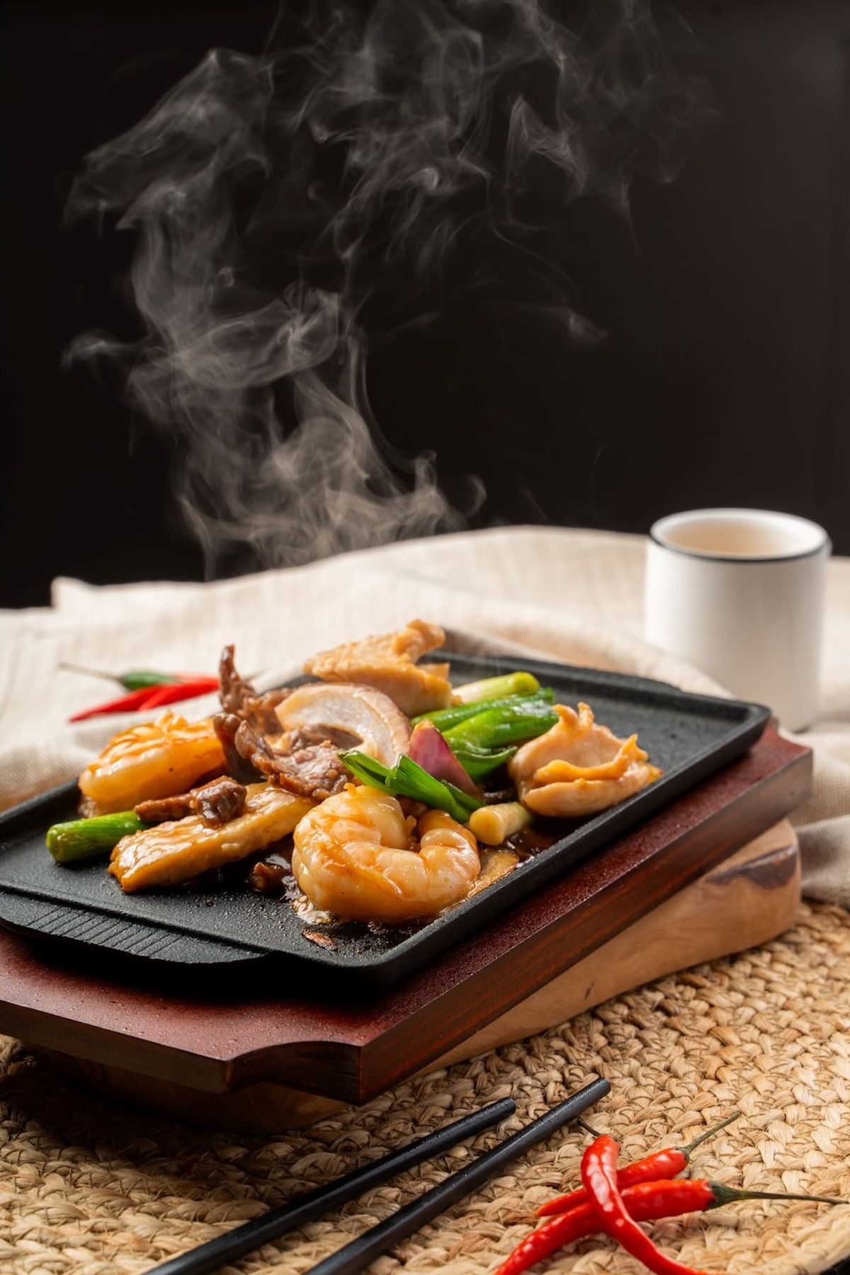 El plato estrella del lugar es el Dim Sum Platter de nueve piezas, que incluye delicias como dumplings de camarones gigantes, dumplings de pato asado, dumplings con trufa negra, rollitos de carne crujiente y camarones fritos crujientes. Otras opciones de dim sum incluyen rollitos de carne con pimienta negra, pimientos rellenos fritos y rollitos crujientes de pato asado.