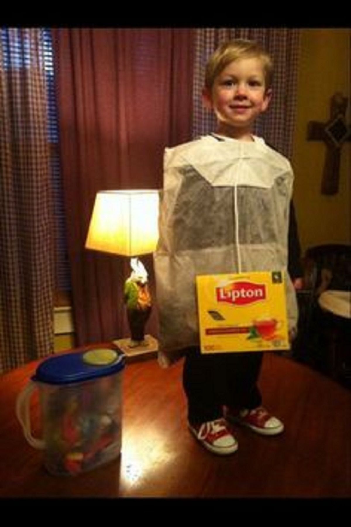 Una idea muy risueña es disfrazar a tu hijo de saquito de té. Sólo precisas tela con transparencias para el torso. Para la etiqueta de la marca puedes usar la tapa de una caja de té.