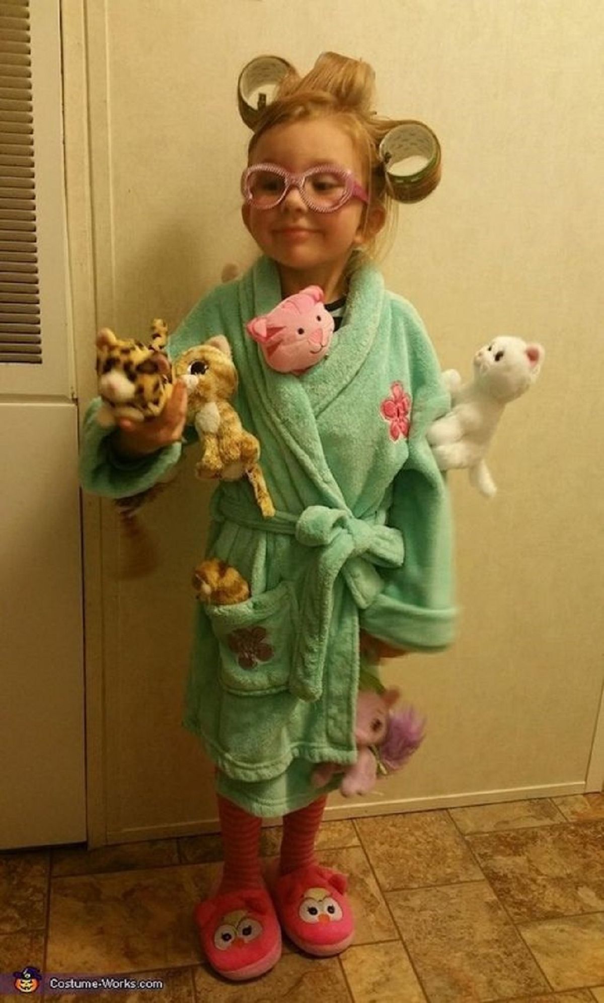 Un disfraz fácil para tu hija es la famosa "loca de los gatos". Puedes llevar a cabo este disfraz con tan sólo unos elementos: una bata de toalla y muchos peluches de gatitos. Complementa el atuendo con unos ruleros de juguete o, si no tienes eso, rollos de cintec.