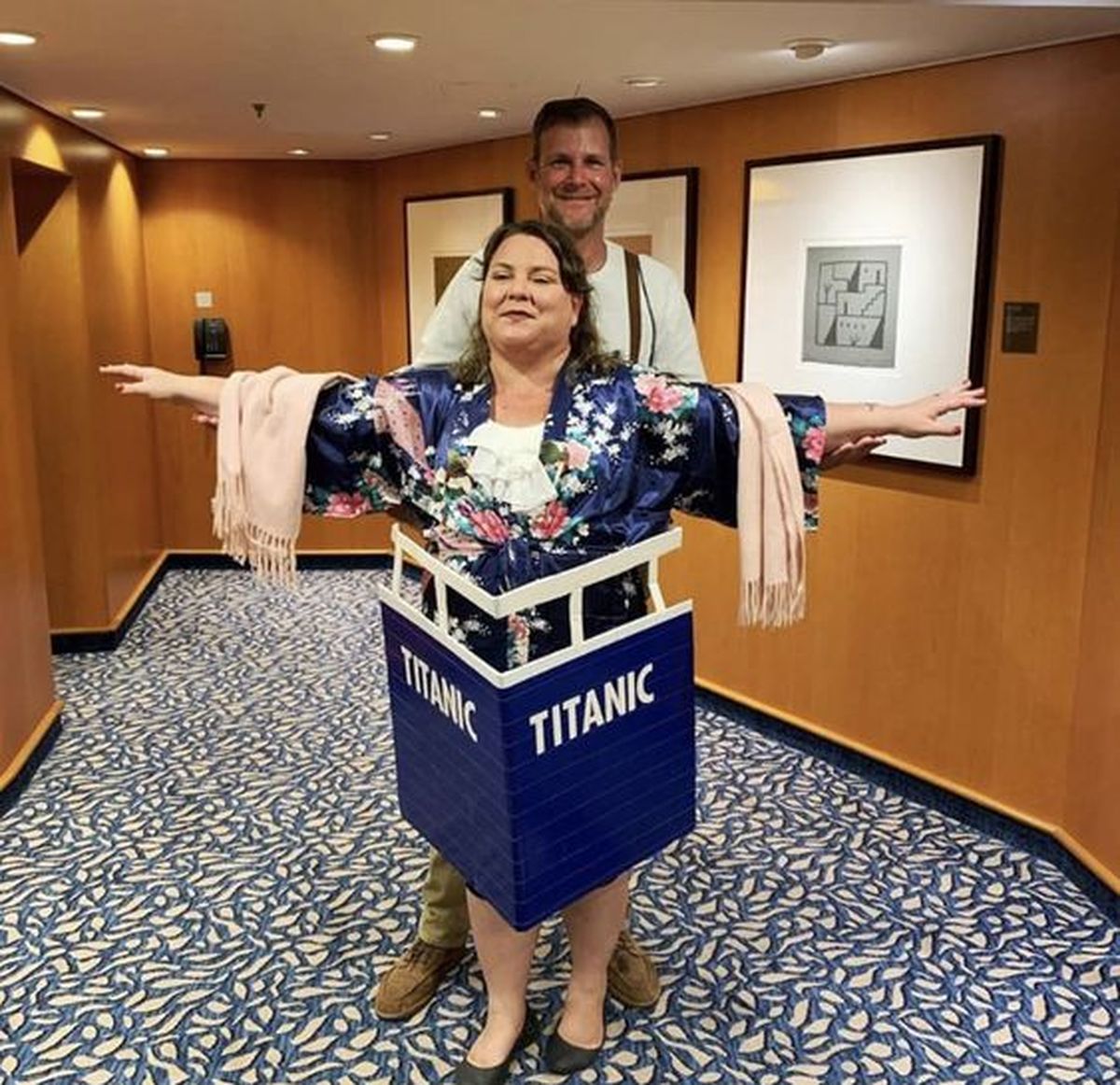 Una referencia clásica del cine es Titanic. Precisas vestidos y atuendos de la época, además de pensar una plataforma de cartón donde se lean las siglas del Titanic.