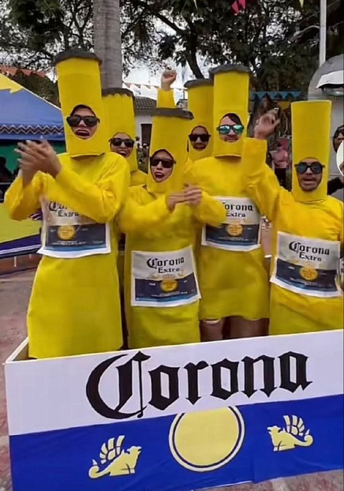 Para los más festivos que adoran los grupos de amigos numeroros, el disfraz de cerveza Corona es espectacular. Sólo deben atender que todos usen las mismas cartulinas, colores y estén unificados todos los atuendos. Puede llevarse a cabo con plataformas de cartón, con agregados de cartulina y acabados con etiquetas similares de la cerveza impresas o dibujadas a mano.