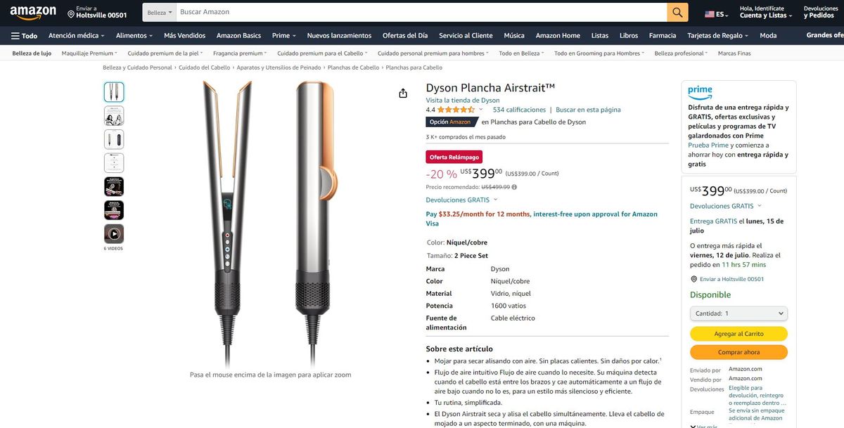 La Dyson plancha Airstrait es otro producto viral con un descuento del 20%, bajando su precio de $499 a $399 dólares. Este artículo para el cabello presenta: