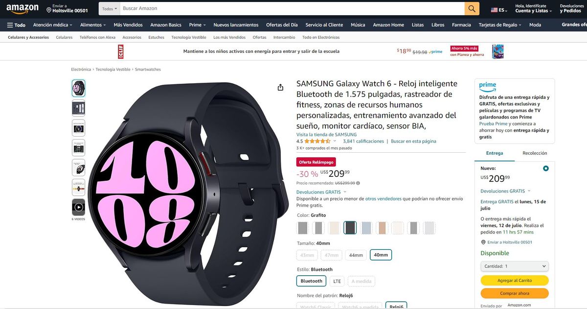 El Samsung Galaxy Watch 6 también está atrayendo mucha atención este Prime Day, con un descuento del 30%, reduciendo su precio de $299,99 a $209,99 dólares. Este reloj inteligente ofrece: