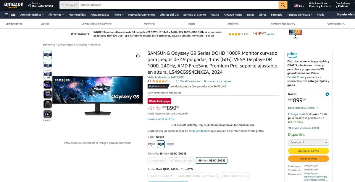 Finalmente, el Samsung Odyssey G9 Series monitor curvado está disponible con un descuento del 31%, reduciendo su precio de $1299,99 a $899 dólares. Este monitor de juegos ofrece: