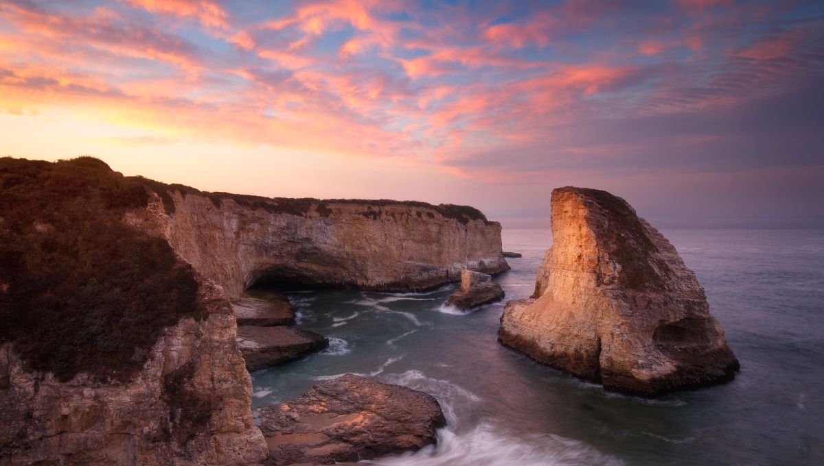 Este espectacular paisaje, junto con la singular isla en forma de aleta de tiburón que sobresale del agua, convierte a Davenport Cove en un destino imperdible para quienes buscan tranquilidad y belleza en la costa de California.