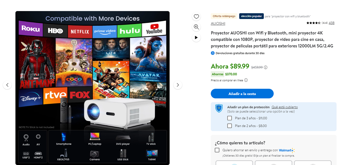 Este proyector que vende Walmart tiene un precio original de 459,99 dólares, pero en una oferta relámpago se está vendiendo solamente a 89,99. Es decir, que la persona que lo compre se estará ahorrando 370 dólares.