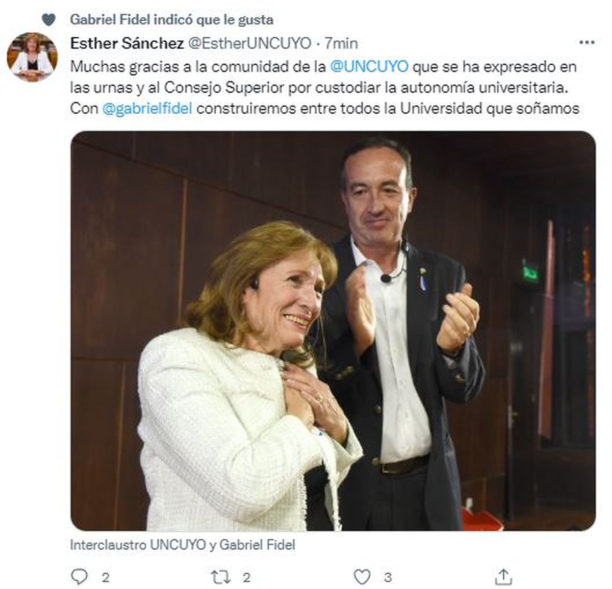Conocida la resolución, Esther Sánchez, rectora electa, mostró su satisfacción en Twitter: