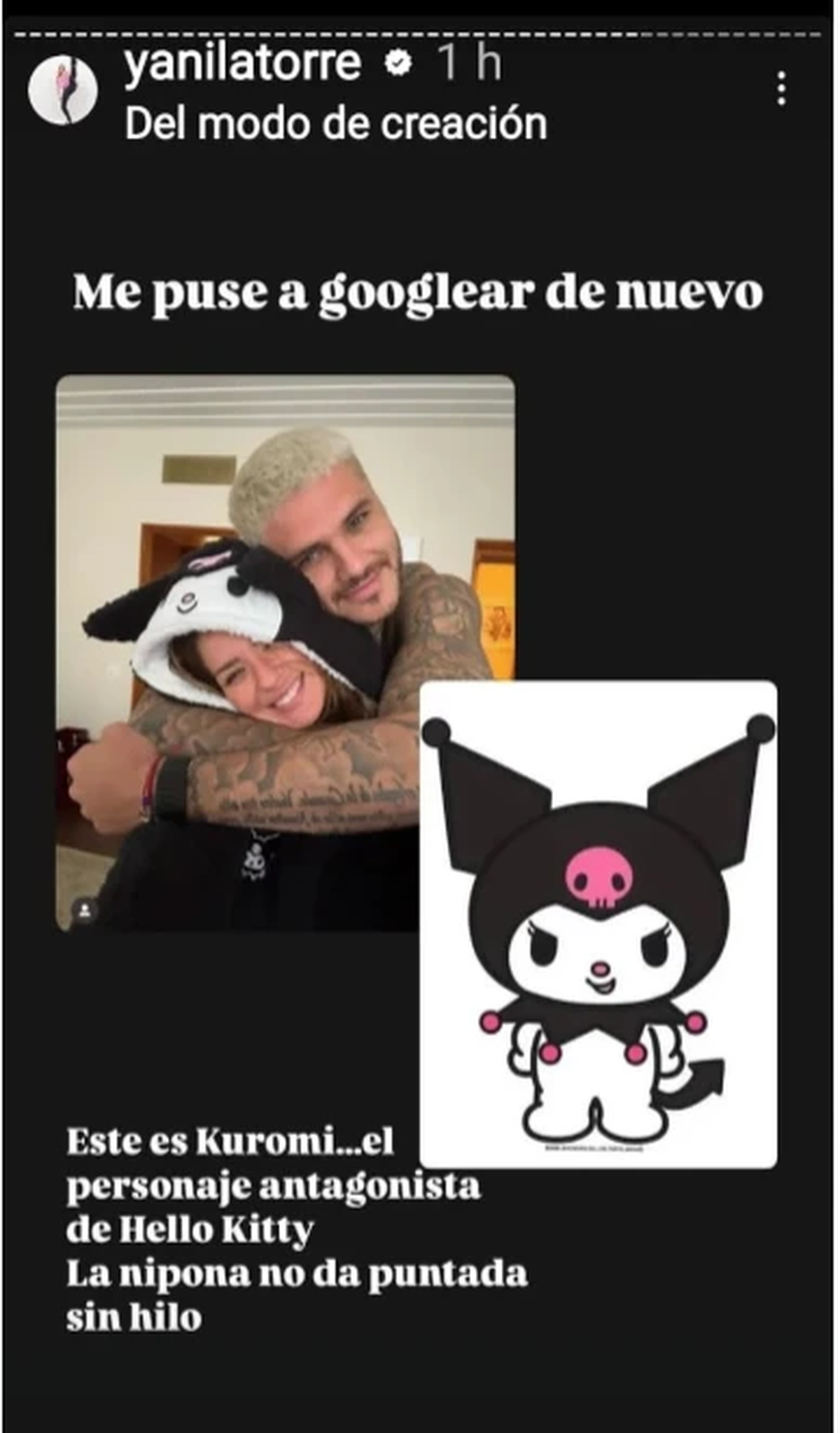 La China Suárez eligió un llamativo tapado de piel con forma de Kuromi el personaje antagonista de la famosa Hello Kitty. La nipona no da puntada sin hilo", expuso Yanina Latorre. "Este personaje es una versión 'oscura' o traviesa de Hello Kitty. Es rebelde, sarcástico, pero encantador. Es el opuesto de Hello Kitty... Me vuelvo locaaaa. Si usaran la cabeza para cosas productivas", siguió.