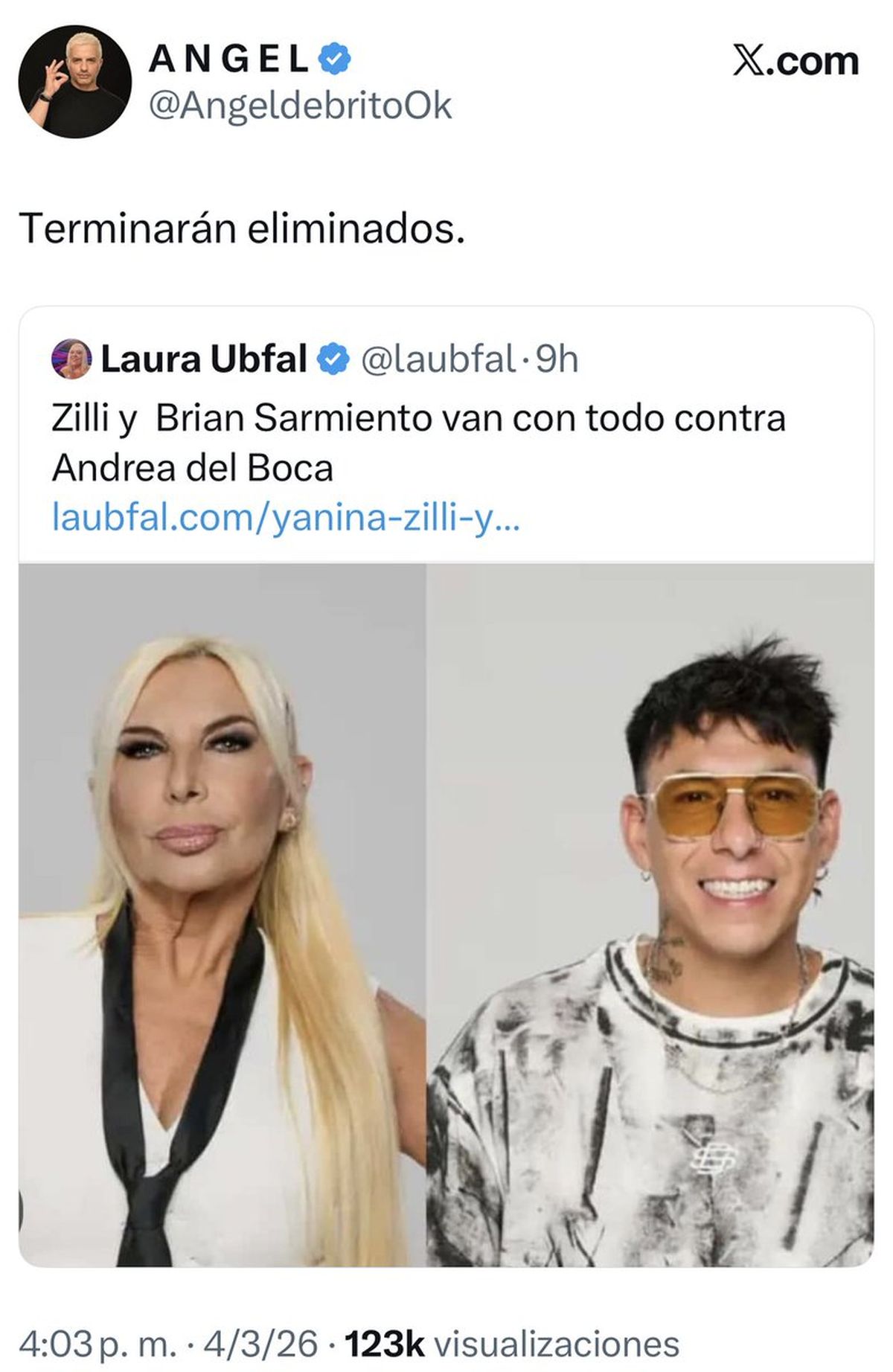 "Zilli y Brian van con todo contra Andrea", escribió La Ubfal y el conductor fue letal. "Terminarán eliminados", anticipó.