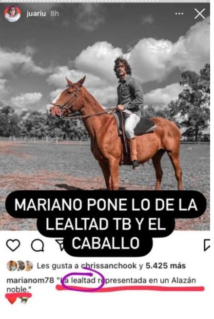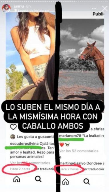 Juariu lanzo su teoría luego de analizar varias historias y publicaciones de Mariano Martínez y Silvina Escudero. La joven descubrió que casi al mismo tiempo, publicaron fotos en Instagram con un caballo.