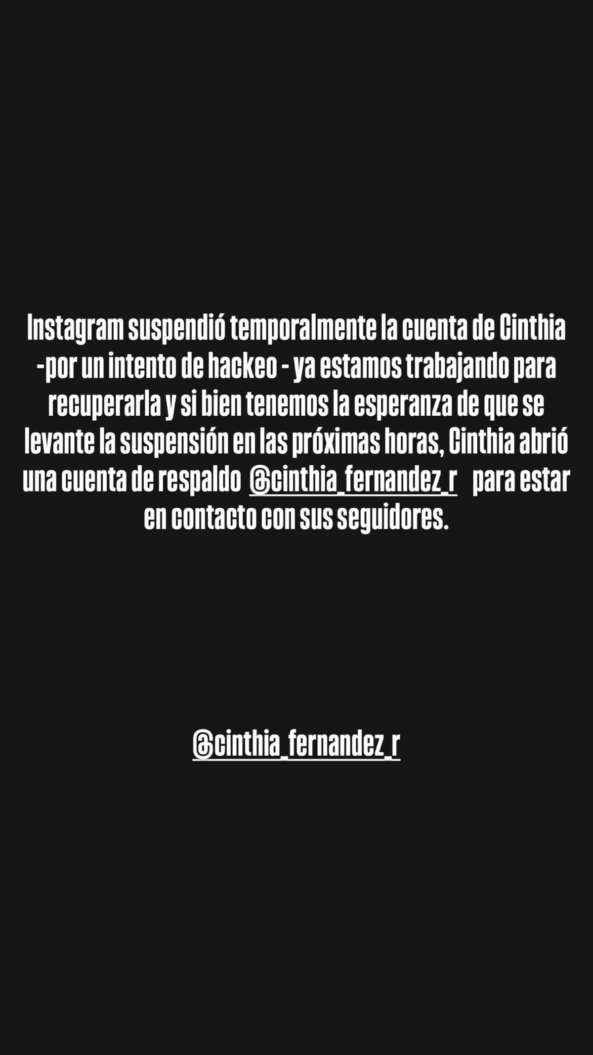 Fue su novio Roberto Castillo quien explicó que debido a varios intentos de hackeo al instagram de Cinthia Fernández su cuenta fue suspendida.