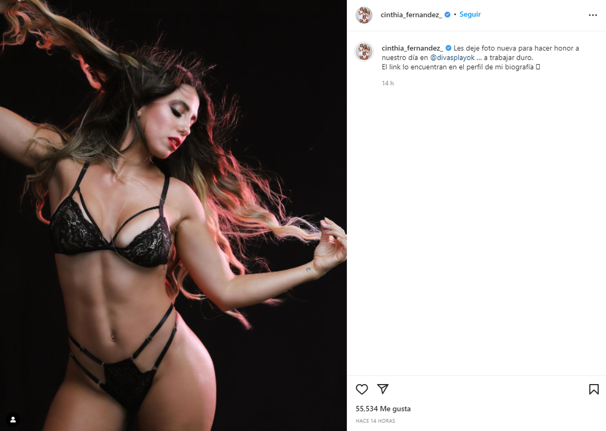 La siempre picante Cinthia Fernández, que hace poco la rompió con un video en Divas Play, no dejó pasar el "Día del trabajador" y compartió una foto en sus redes invitando a sus seguidores a la plataforma para adultos.