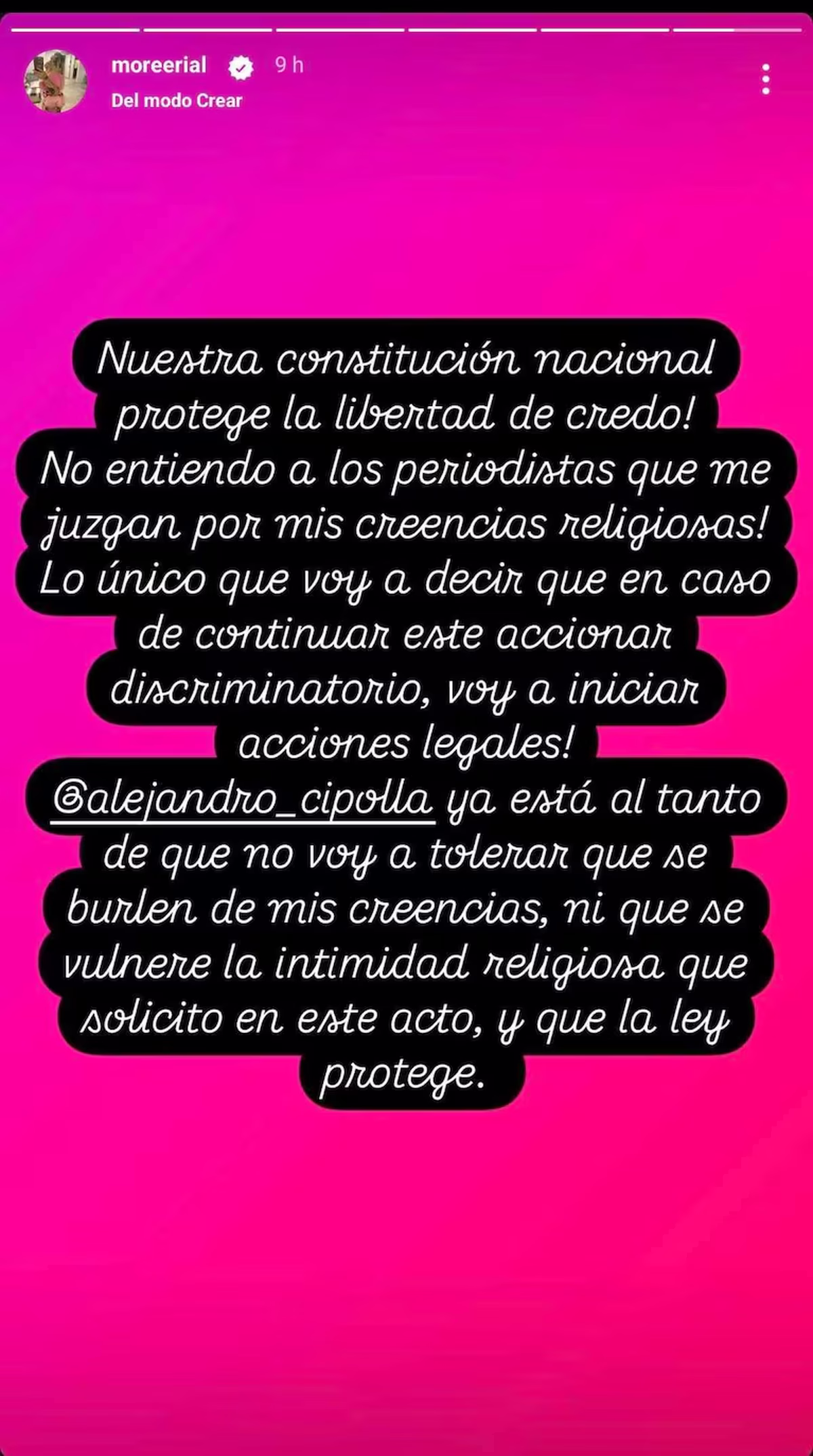 “Alejandro Cipolla ya está al tanto de que no voy a tolerar que se burlen de mis creencias ni que se vulnere la intimidad religiosa que solicito en este acto y que la ley protege”, cerró indignada.