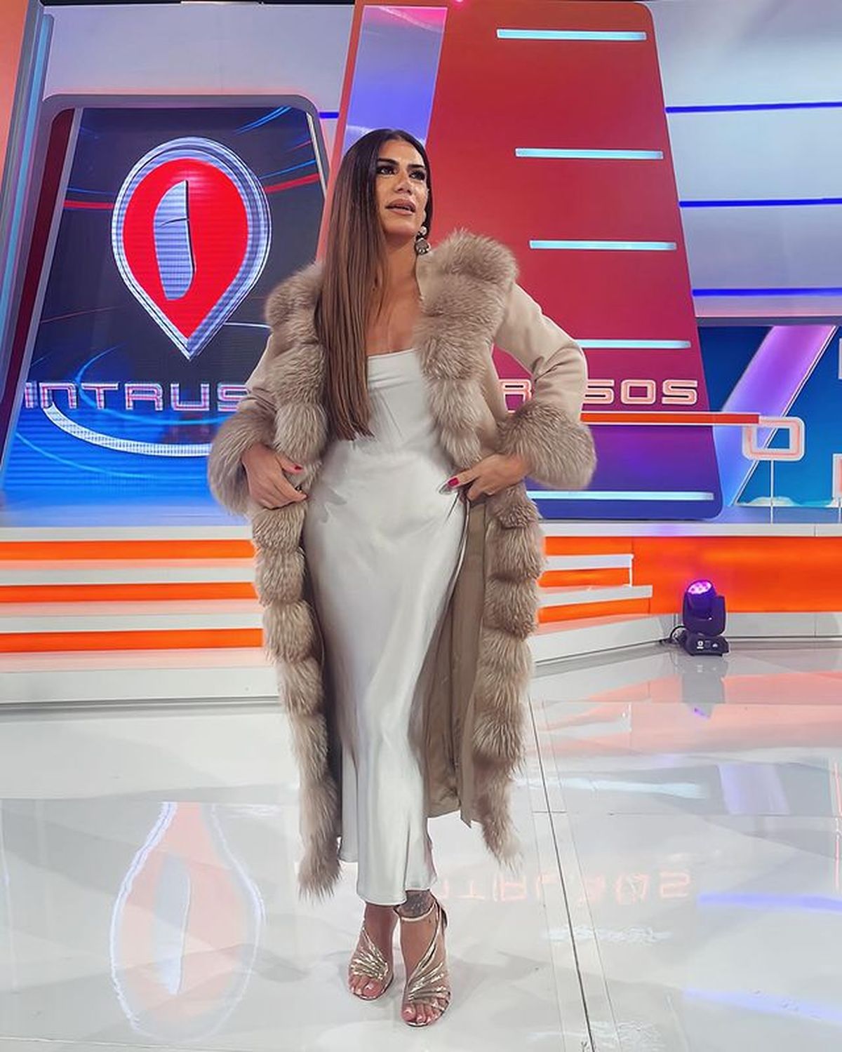 Florencia de la V arrancó marcando su silueta con un slip dress lencero de seda color plata, de lo más sensual, agregando el tapado infaltable del mob wife.