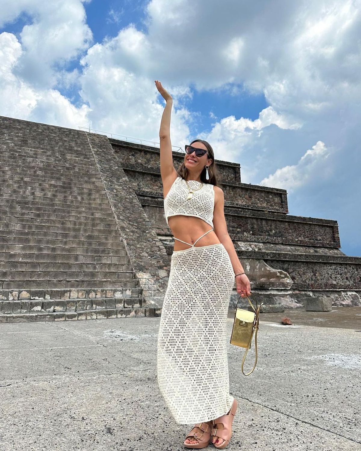 En esta oportunidad, Pampita visitó las famosas pirámides de Teotihuacán y para la impactante excursión sorprendió con su look off-white.