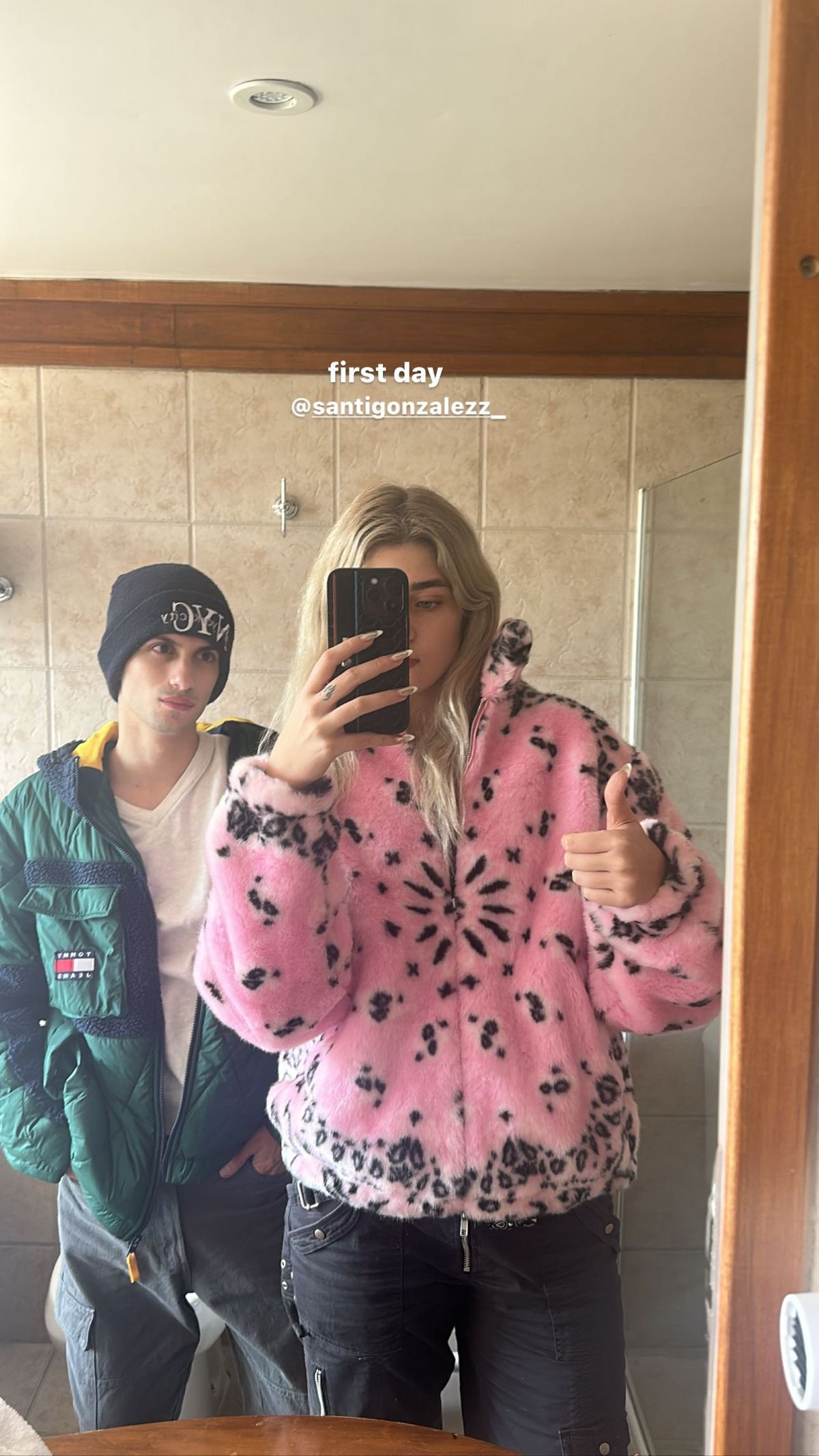 Súper girly y femenina, Martita eligió un buzo XL de polar color rosa Barbie con estampa animal print y lo llevó con unos pantalones cargo logrando una combinación cancherísima.