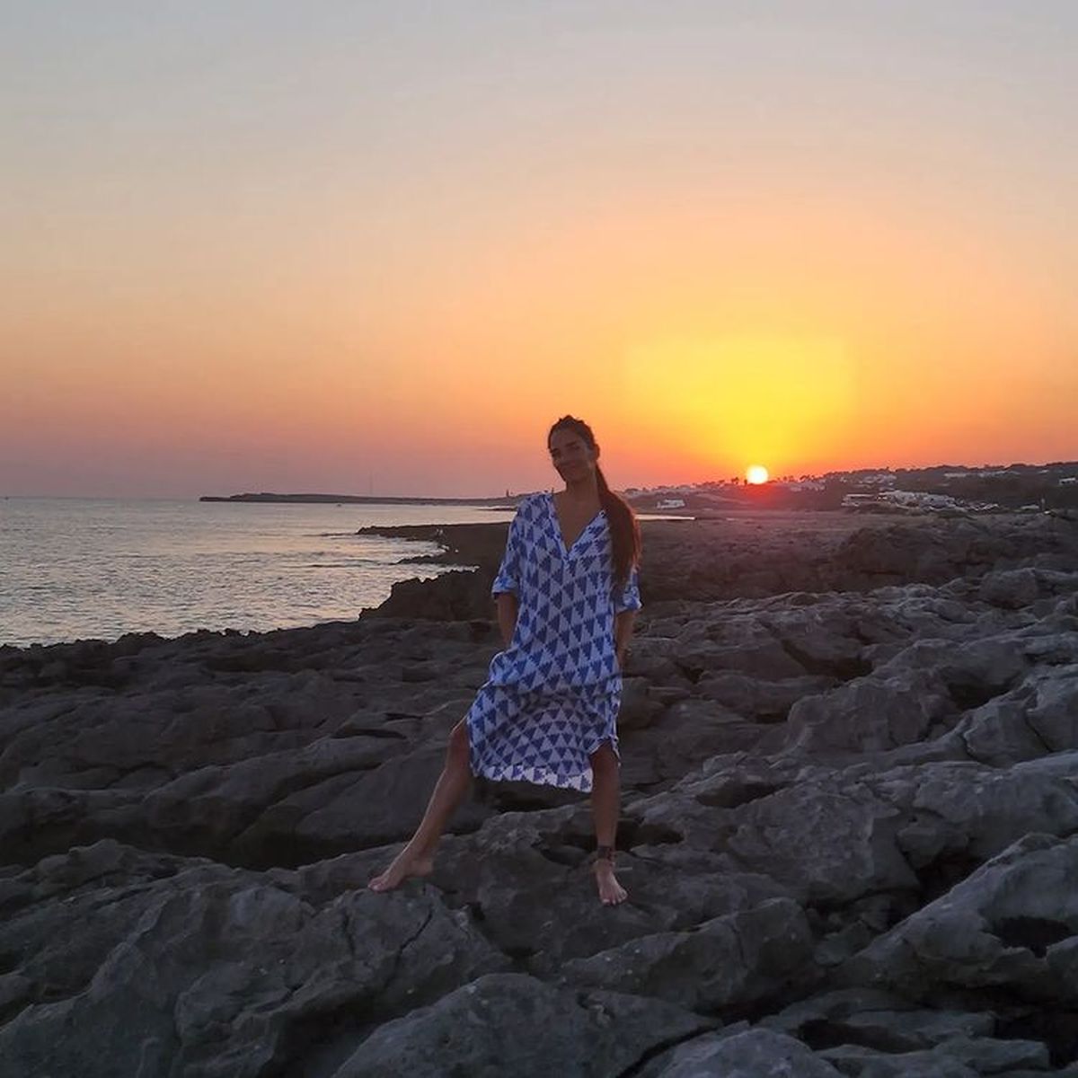 Siempre natural, Juana Viale posó con un fabuloso atardecer de fondo y lució una túnica estampada boho chic, pelos al viento y nada de maquillaje.