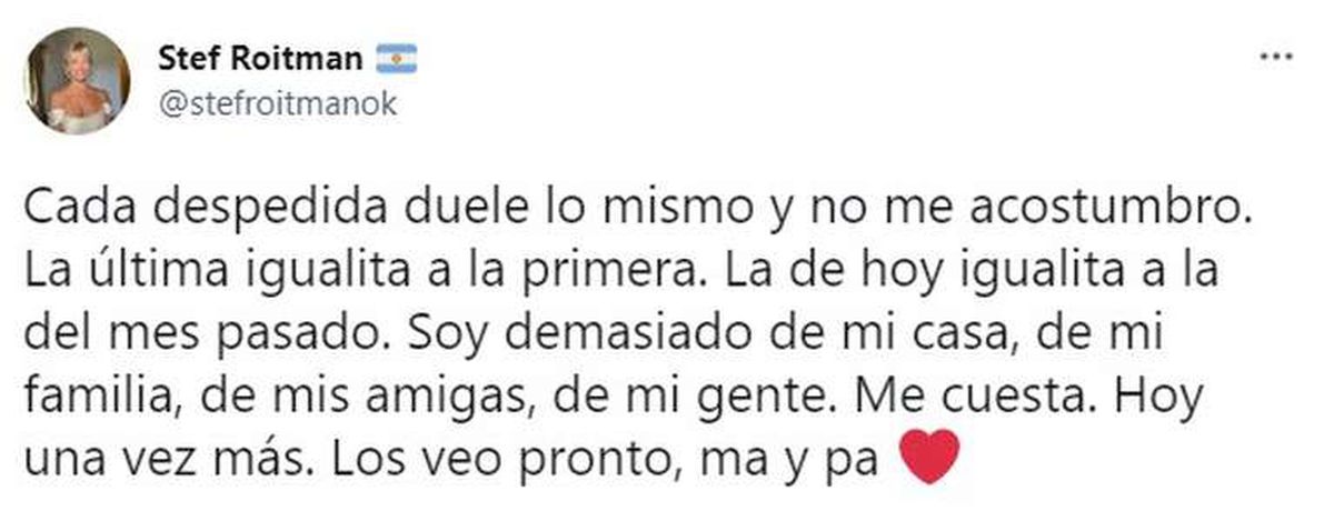“Cada despedida duele lo mismo y no me acostumbro. La última igualita a la primera. La de hoy igualita a la del mes pasado”, comenzó diciendo Stefi en Twitter luego de que sus padres fueran a verla.