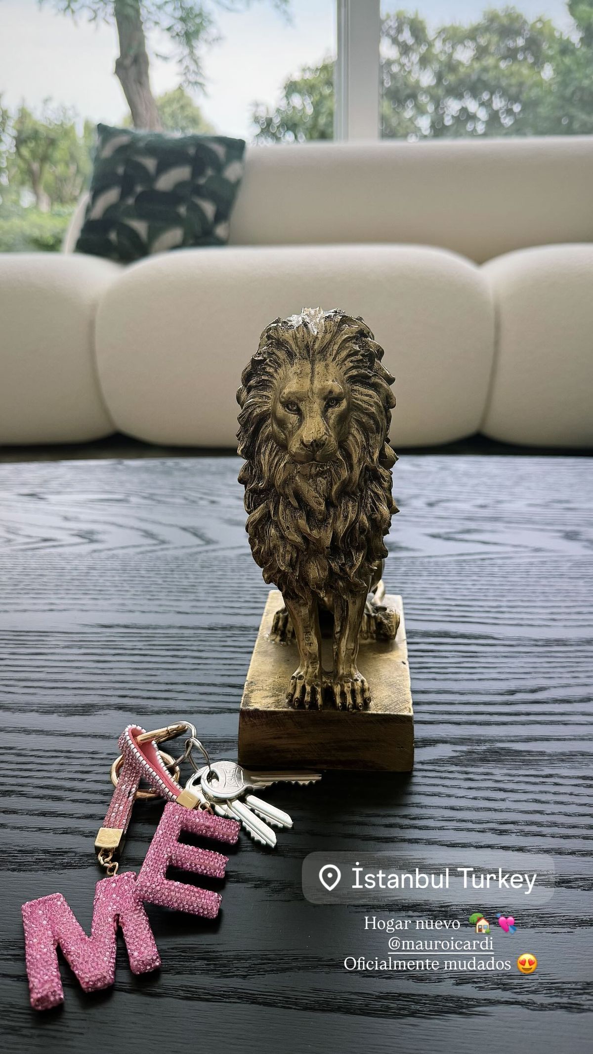 A través de una foto de un juego de llaves y un león de bronce, la China Suárez comunicó por todo lo alto su mudanza a su nueva mansión.