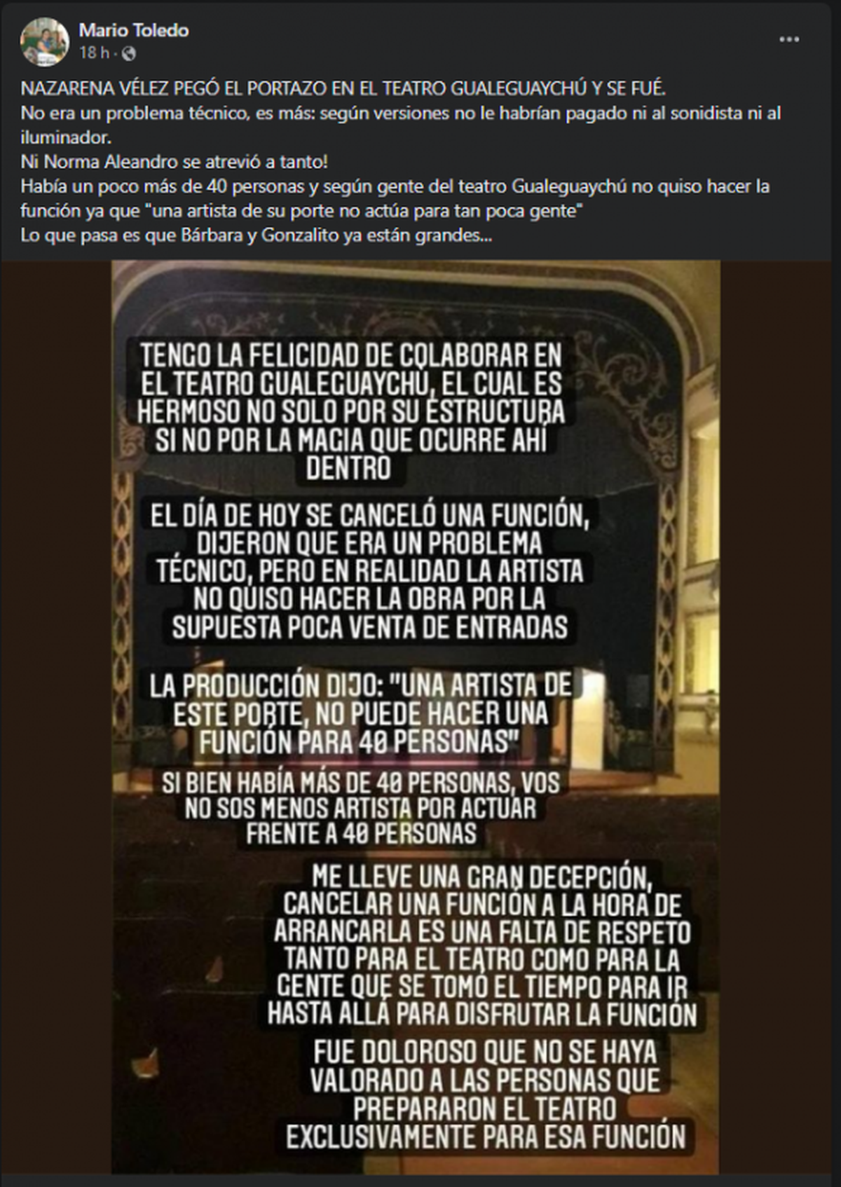 “Ya estoy en casa, me fui de Gualeguaychú, que está muy lindo. Me arrepiento de no haber hecho la obra. Fuimos a La Paz y Concepción del Uruguay y nos fue bien. Hoy en Gualeguaychú, sacando las cuentas nos dimos cuenta que había muy poca gente. Lo que tenía que aportar para hacer la función me hacía perder plata. Y yo no soy una mina que tenga guita, no puedo perder plata", aseguró afectada.