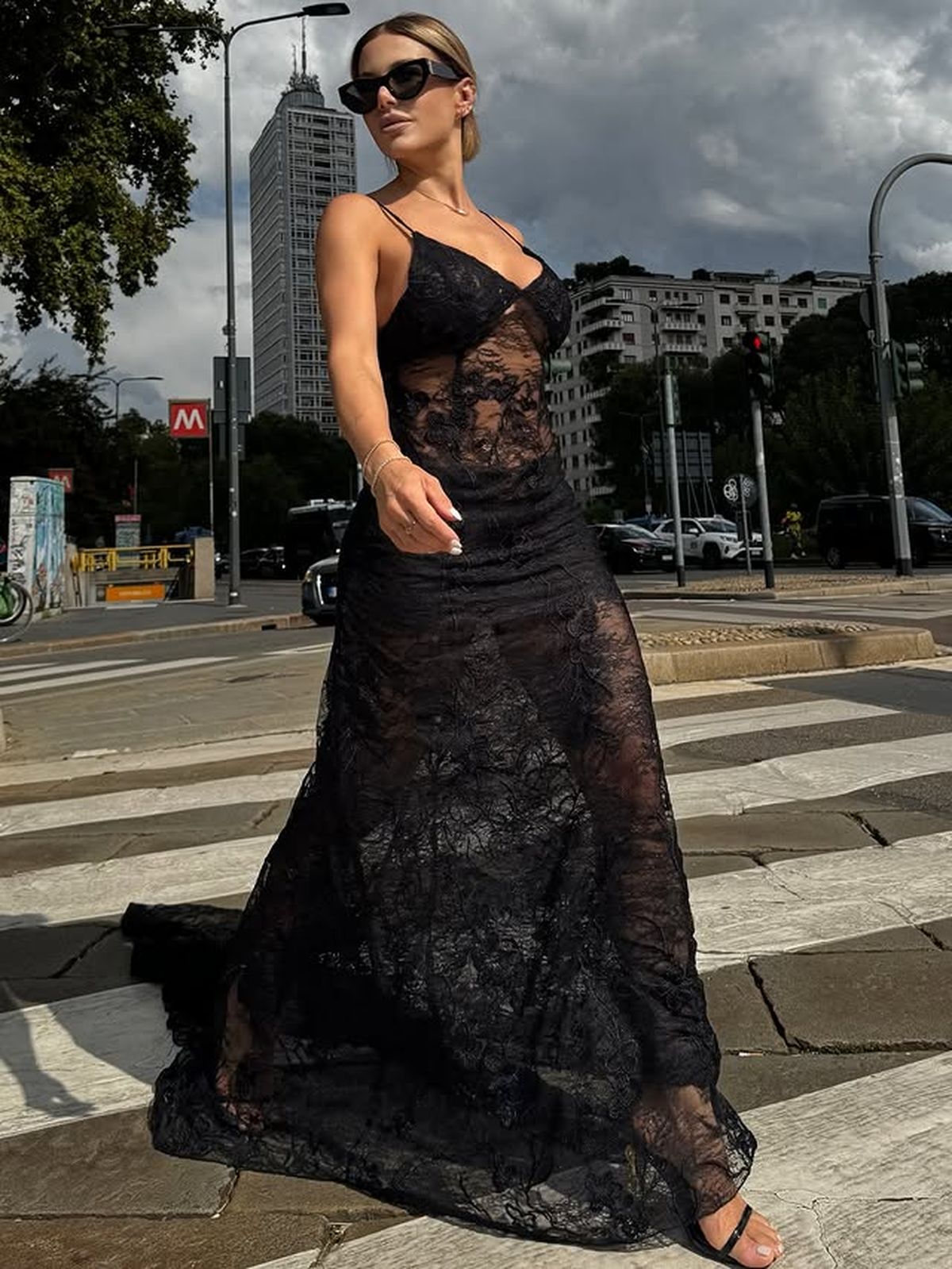 De lo más atrevida, Evangelina Anderson paseó por Milán luciendo un vestido lencero de transparencias de encaje dejando a la vista su short culotte.