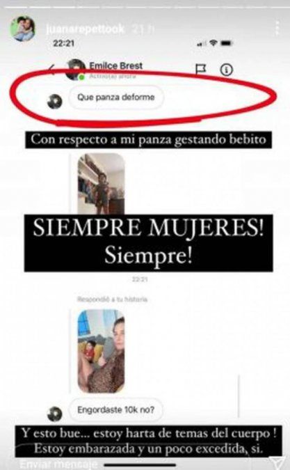 La usuaria le consultó a través de mensaje privado si había "subido 10 kilos" y la actriz estalló de furia. “Con respecto a mi panza gestando bebito. Siempre mujeres, ¡siempre!”