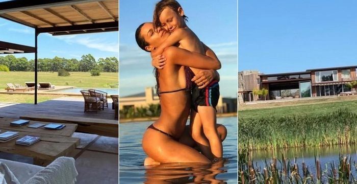 Entre las muchísimas comodidades, la construcción cuenta con una pileta endless (de borde infinito), gimnasio, galería con living campestre, parrilla, cuatro dormitorios y vista a una laguna. Además, Pampita subió algunas postales junto a sus hijos, Bautista, Benicio y Beltrán, disfrutando de la piscina.