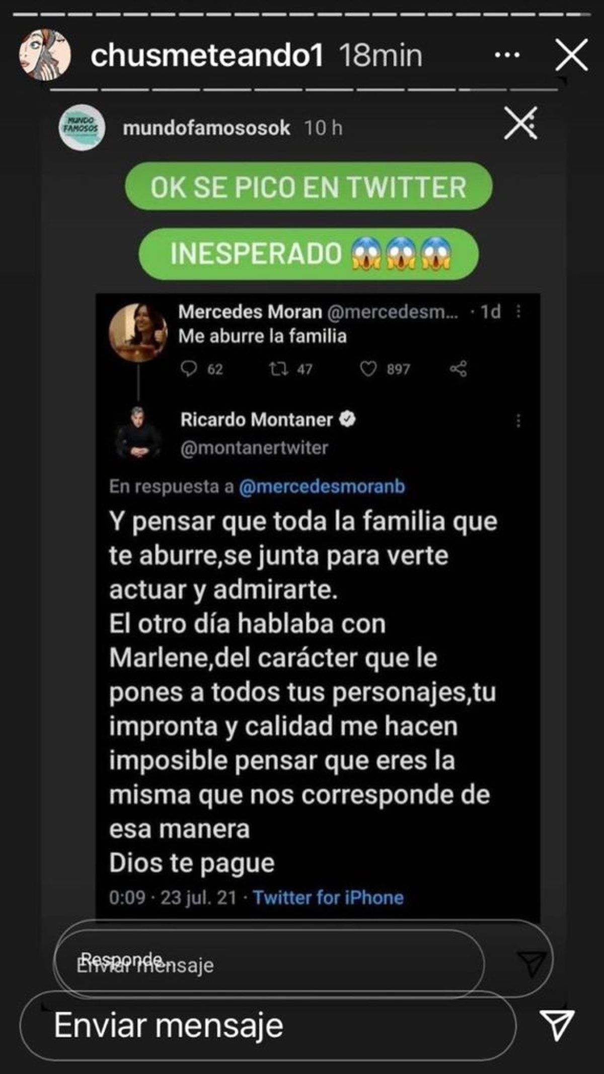 "El otro día hablaba con Marlene del carácter que le pones a todos tus personajes, tu impronta y calidad me hacen imposible pensar que eres la misma que nos corresponde de esa manera. Dios te pague”, cerró indignado.