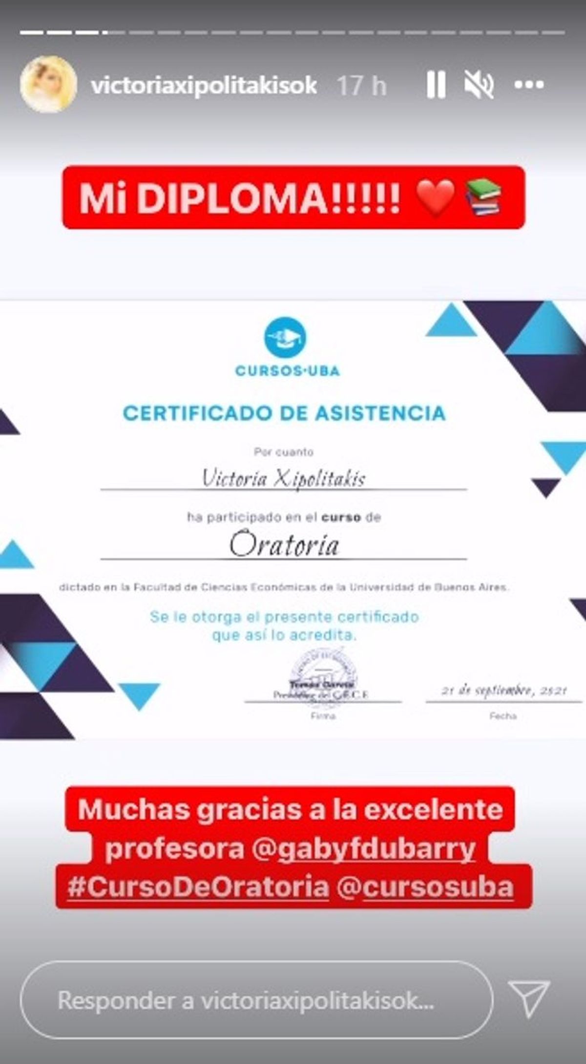 “Les quiero decir algo, estoy muy contenta de poder mejorar mi parte intelectual. Terminé mis cursos de oratoria. Estudié, me recibí y llegó mi certificado de la UBA”, remarcó Vicky con mucha satisfacción.