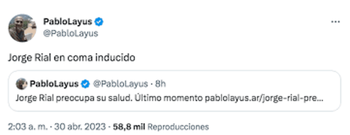 Según lo publicado por el periodista cordobés en su cuenta de twitter, Jorge está en coma inducido debido a que su cuadro de salud empeoró.