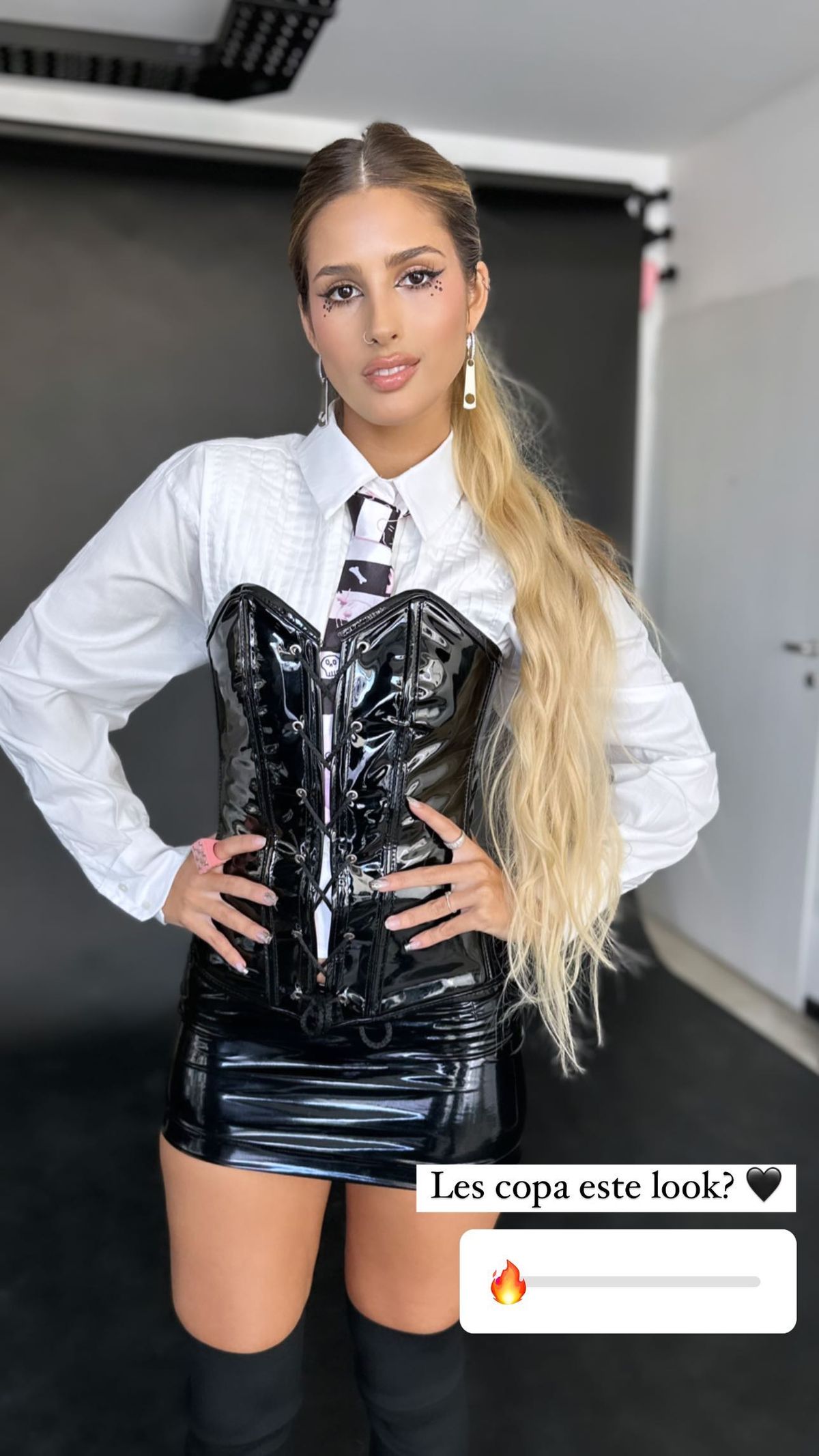 Una vez más, Julieta Poggio dinamitó el termómetro con un corset de látex fajado y mini diminuta combinándolos con camisa blanca por debajo, moño anudado en el cuello y medias negras bucaneras logrando u atuendo dominatrix fuera de serie.