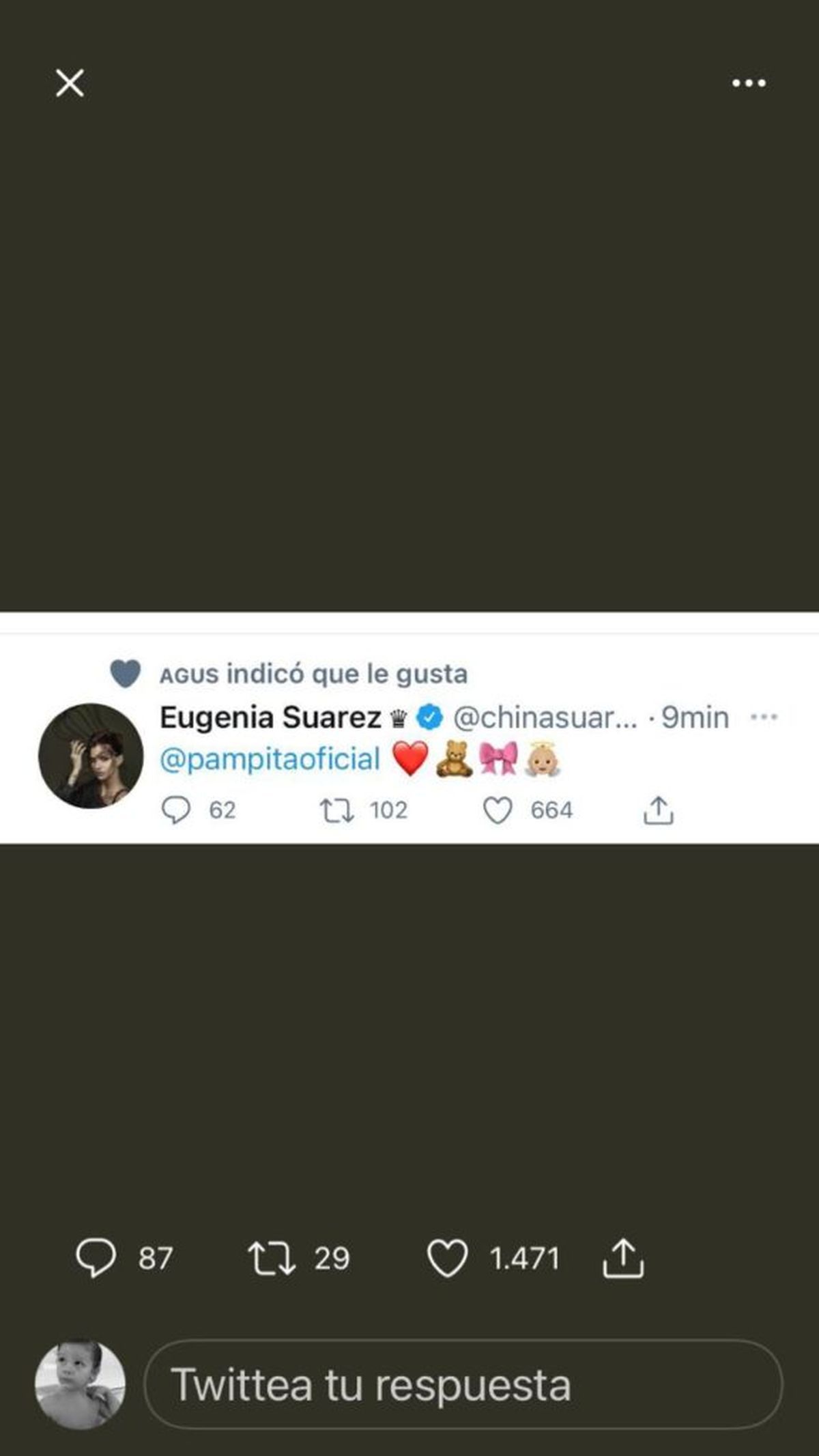 La mujer de Vicuña publicó en Twitter emoticones Corazón, osito, moño y ángel arrobando a la morocha.