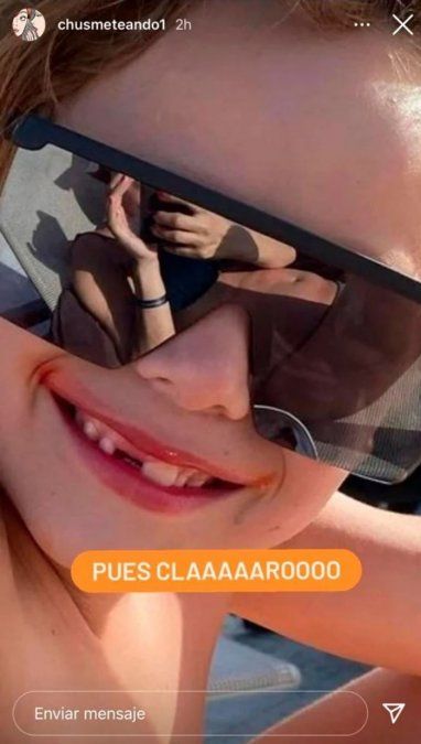 En uno de sus últimas historias en Instagram, la modelo retrató uno de sus hijos en una reposera charlando con ella. En la imagen se ve al pequeño luciendo unas gafas espejadas y en su reflejo la panza de Pampita lo que volvió a generar sospechas.