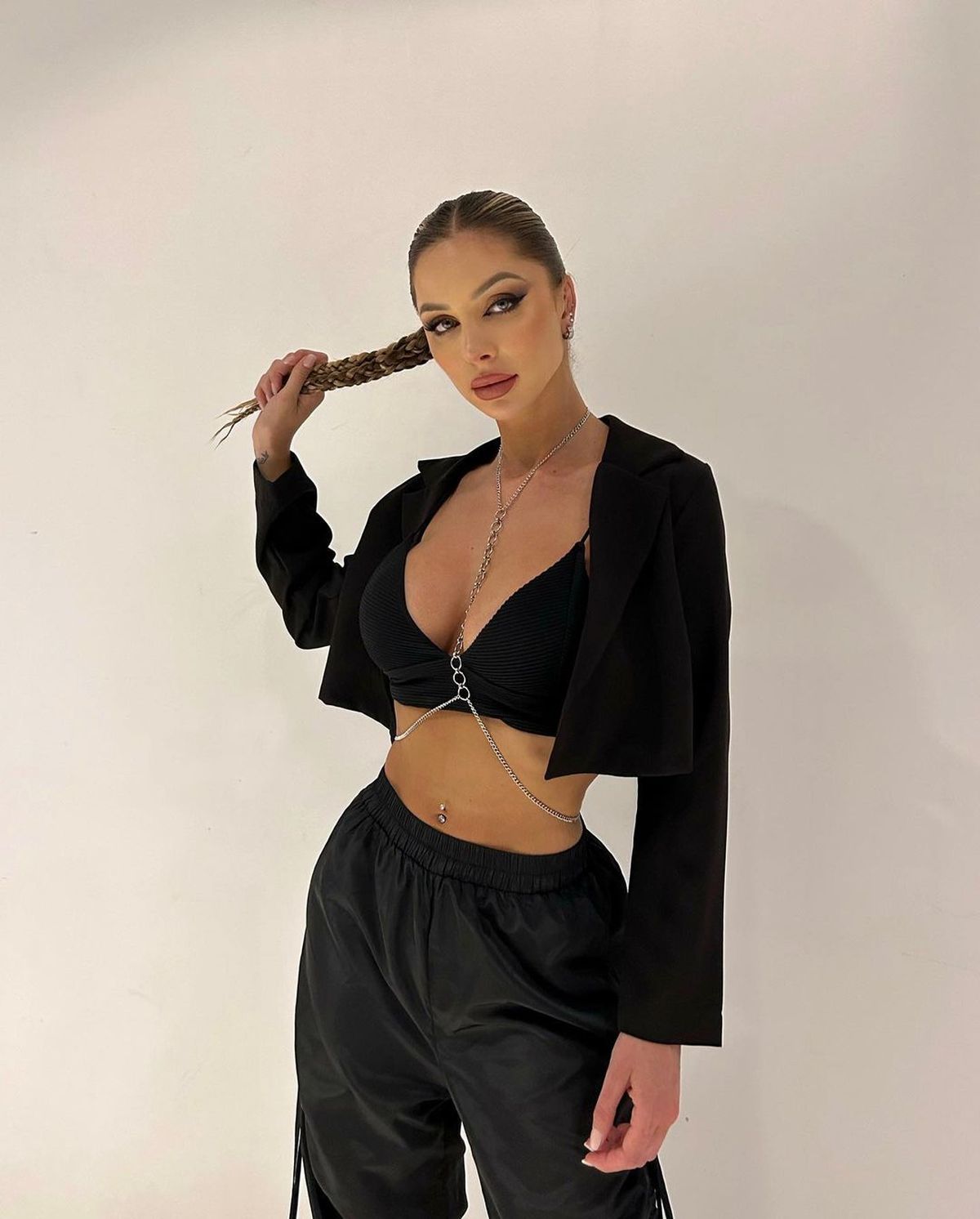 Romina eligió un look total black de crop top, chaqueta corta y babucha y como siempre arrasó con su lomazo escultural. "Chau marzo, se viene festival de música en abril y estoy muy manija", escribió feliz con sus futuros proyectos.