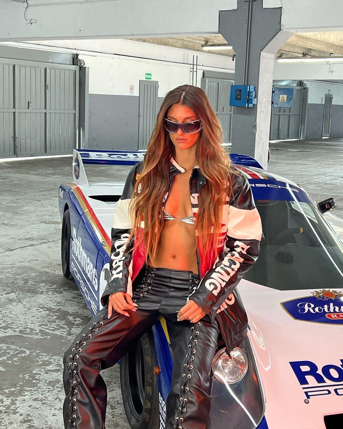 Inspirada en la tendencia racer, otra de las infaltables de la temporada, Lola Latorre agregó chaqueta de cuero motoquera y hasta posó de lo más picante con un auto de carrera de fondo.
