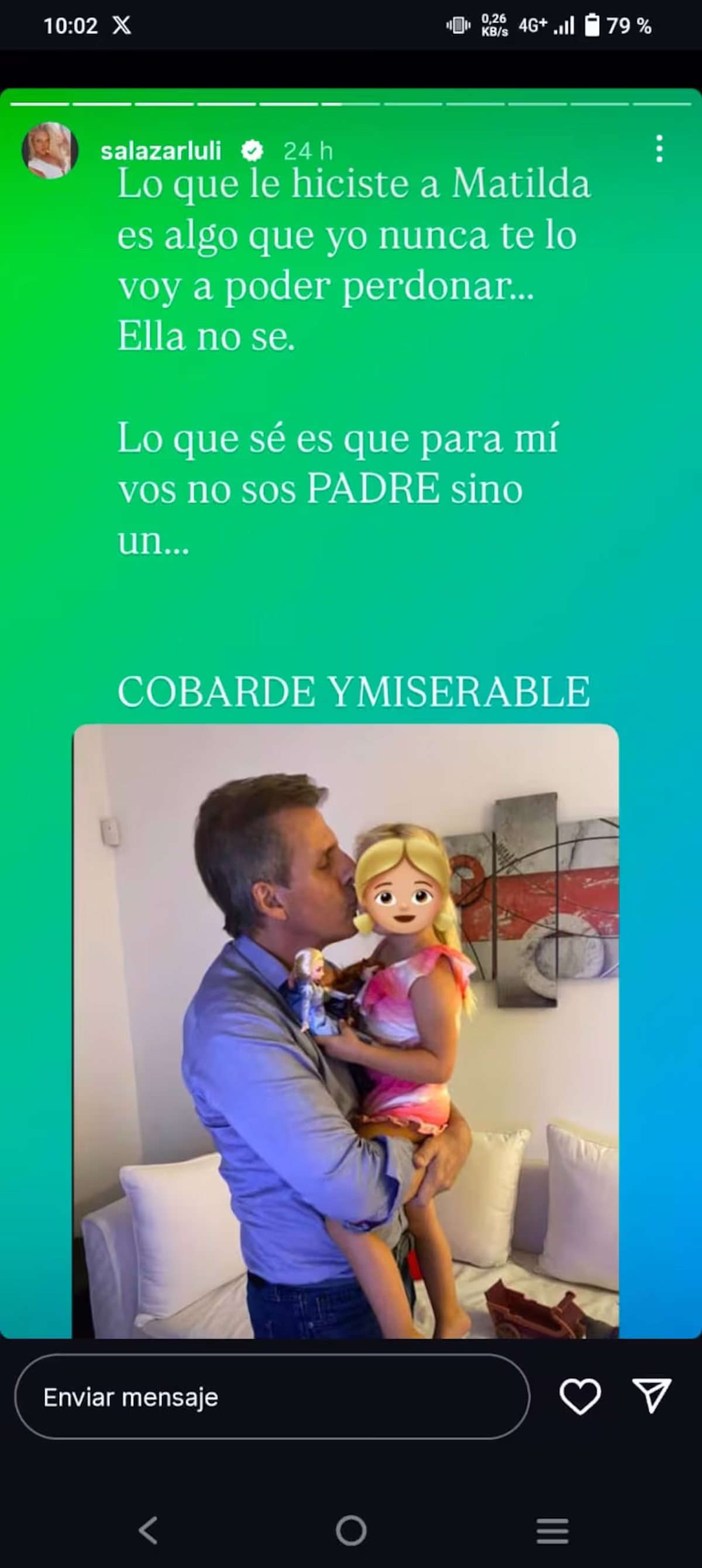 "Vos también sos madre y podrías colaborar para hacerle entender que está mal lo que le hizo y hace a Matilda. También te invito cuando quieras a mostrarte todas las pruebas", cerró indignada.