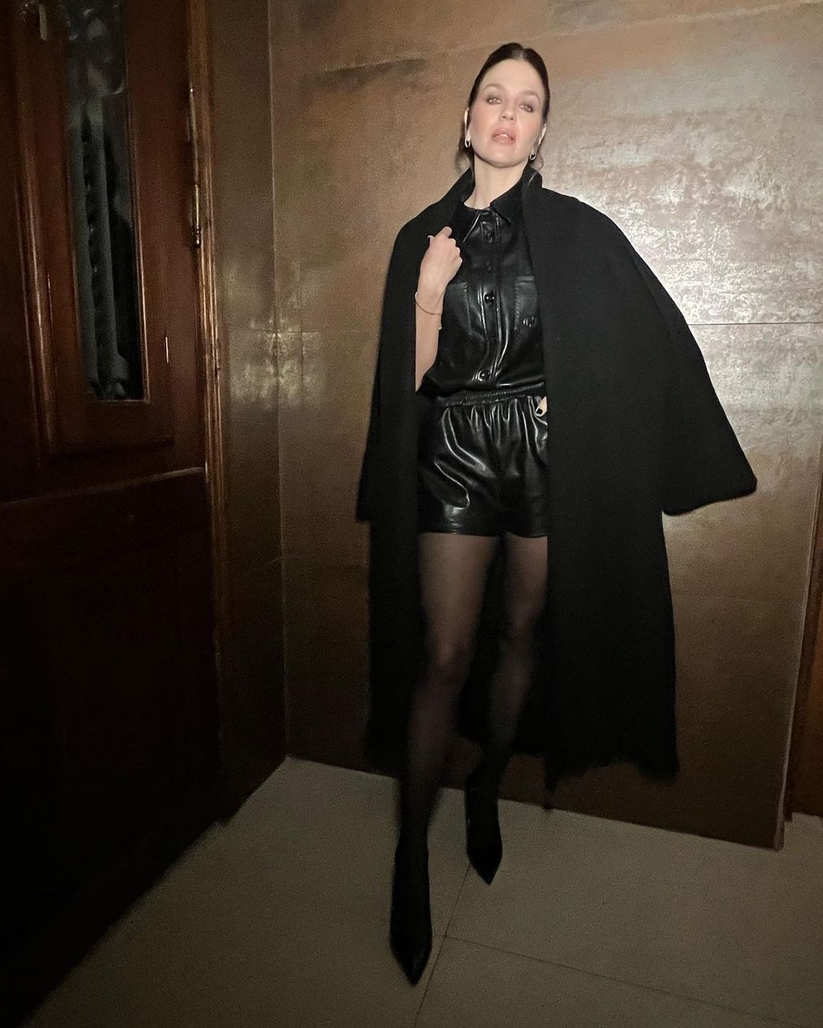 La diosa llevó este must have al máximo con un conjunto negro monocolor compuesto por mini shorts, campera y medias transparentes al tono.