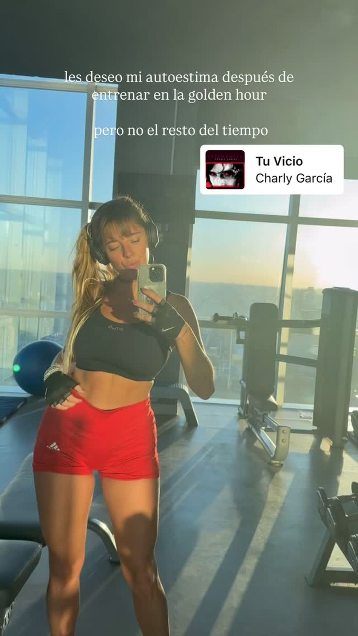 "Les deseo mi autoestima despúes de entrenar en la golden hour per no el resto del tiempo", escribió junto al tema "Vicio", de Charly García de fondo y mostrando su cuerpazo marcado por una calzas extra small coloradas y corpiño negro crop.