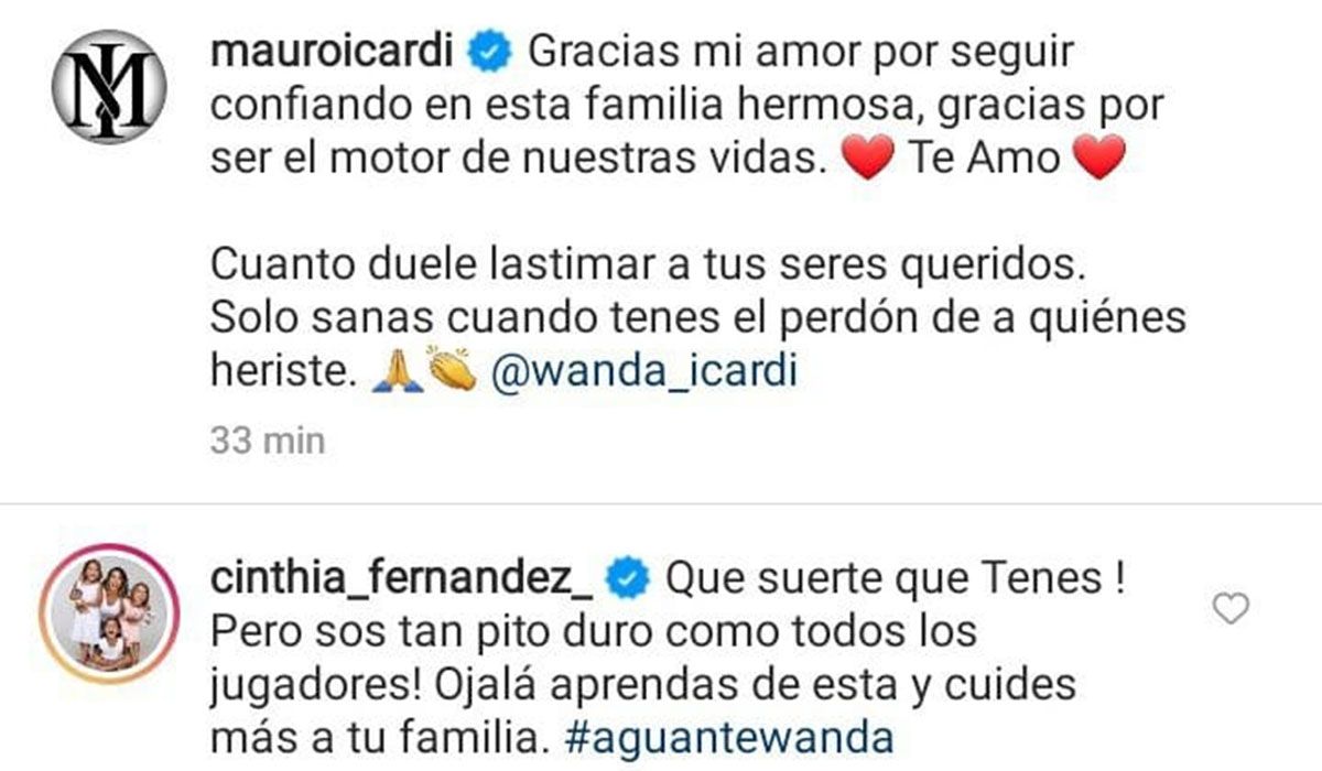 Entre los miles de comentarios que tuvo el posteo, que ya tiene más de un millón de me gustas, estuvo el de Cinthia Fernández, quien no se guardó nada: "¡Qué suerte que tenés! ¡Pero sos tan pito duro como todos los jugadores! Ojalá aprendas de esta y cuides más a tu familia. #AguanteWanda".