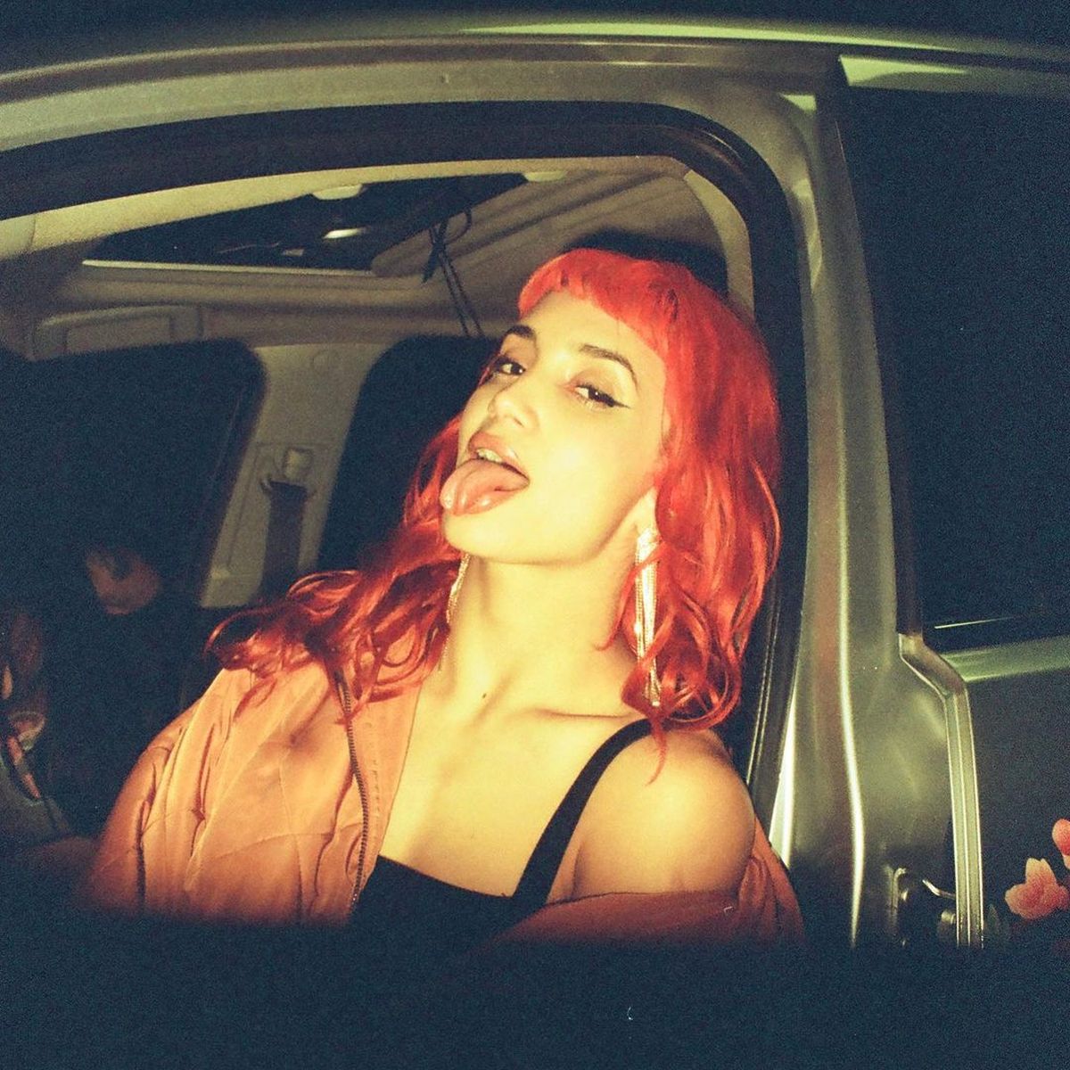 "Tbt para pikete", escribió atrevida junto a la foto posando desde un auto con actitud feroz y sacando la lengua.