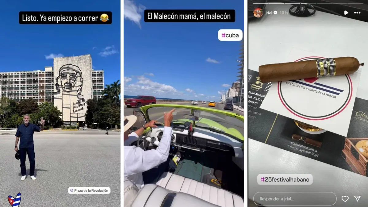 Desde allí, Jorge Rial no para de subir fotos y videos de sus paseos en descapotable, visitas, recorridos y, por supuesto, degustaciones de habanos.