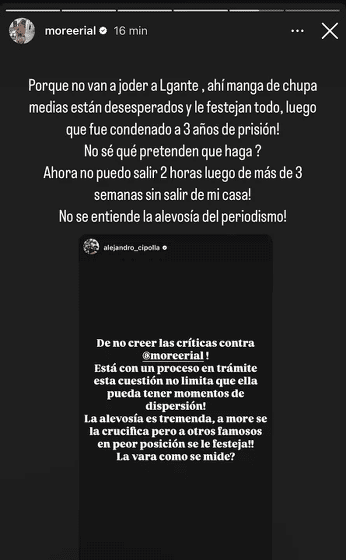 A lo que Morena sumó. "¿Por qué no van a joder a L-Gante? Ahí manga de chupa medias están desesperados y le festejan todo, luego que fue condenado a tres años de prisión. Ahora no puedo salir dos horas, luego de más de tres semanas sin salir de mi casa. ¡No se entiende la alevosía del periodismo!".