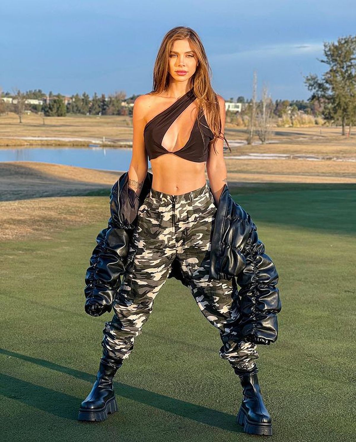 Para su sesión, Romina Malaspina eligió su look más "guerrero" con un pantalón camuflado y crop top dejando a la vista su tonificado abdomen.