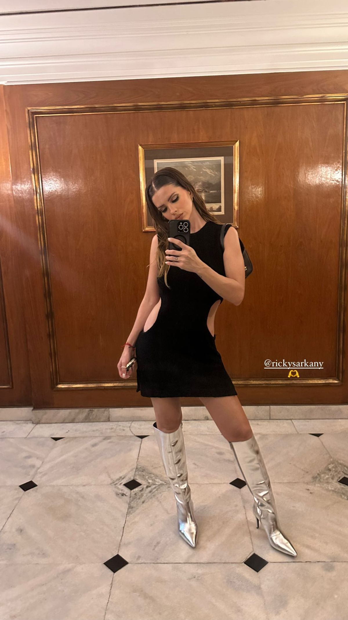 Súper sexy, la China se sumó a la tendencia de los cut-outs con un vestido negro con recortes en el abdomen de lo más atrevido que dejaba mucha piel a la vista y los combinó con botas metálicas para un touch más canchero.