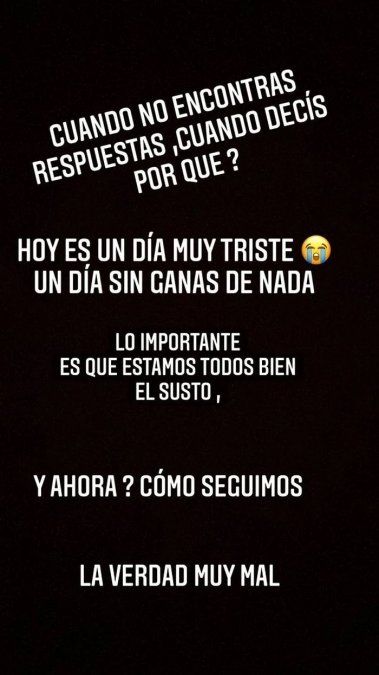 "Cuando no encontrás respuestas, cuando decís ¿por qué? Hoy es un día muy triste, un día sin ganas de nada. Lo importante es que estamos todos bien, el susto. Y ahora qué, cómo seguimos? La verdad muy mal", comenzó diciendo.